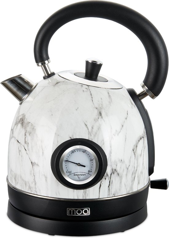 De retro waterkoker EK3TM van het merk MOA is een echte blikvanger. De waterkoker ziet er uit als een ouderwetse fluitketel en is gemaakt van roestvrij staal. Het geeft het product een stijlvolle en retro-look. De retro-look wordt gecombineerd met een handige, ingebouwde thermometer. Hiermee zie je in één oogopslag hoeveel graden Celsius het water is. Ideaal als je je water niet helemaal kokend wilt hebben. Een groene thee komt bijvoorbeeld beter tot zijn recht als deze bereid wordt met water dat 70 tot 75 graden Celsius warm is.